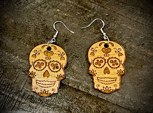 Earrings - Sugar Skulls engraved on Cherry Wood