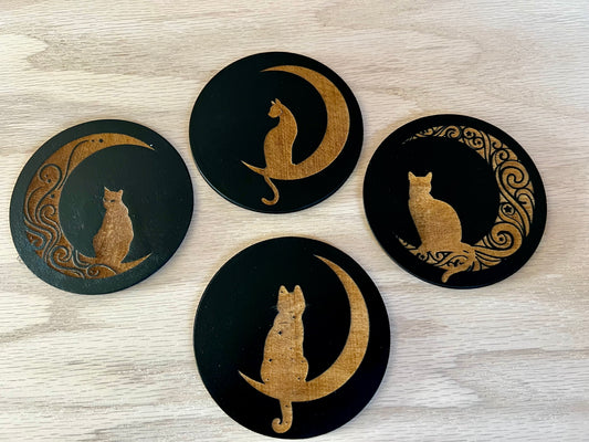Coaster Set - Cats & Moons engraved wood with cork backing (set of 4)