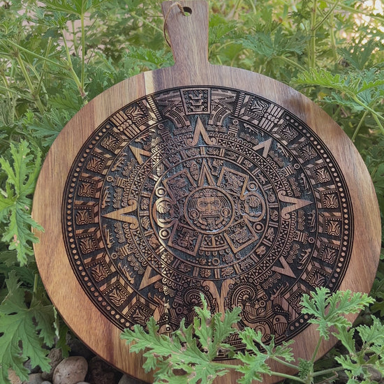 Experience the beauty of the Aztec culture with our Charcuterie Board. Made from stunning acacia wood, this board features a high detail engraving of the Aztec calendar. Perfect for entertaining, impress your guests with this unique, Food Safe and expertly crafted board. When not in use it makes for stunning decor!