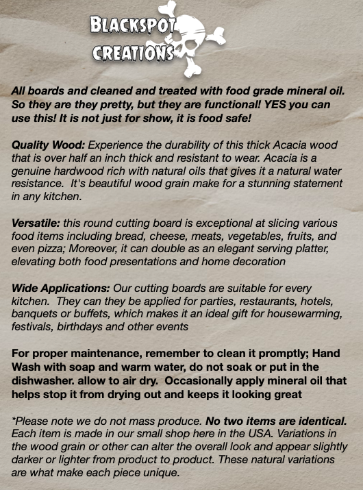 "Keep your appetizers dead delicious with this Charcuterie Board. Featuring The Doomed Tightrope Walker Sally Slater, one of the 999 Happy Haunts from your favorite mansion. Engraved on beautiful Acacia Wood, approximately 16" X 8". Spookily stylish for any "ghoul"timate gathering! Pretty to look at, but 100% safe to use! No stains or dyes used!! On the reverse we even included Sally Slaters tragic tale.