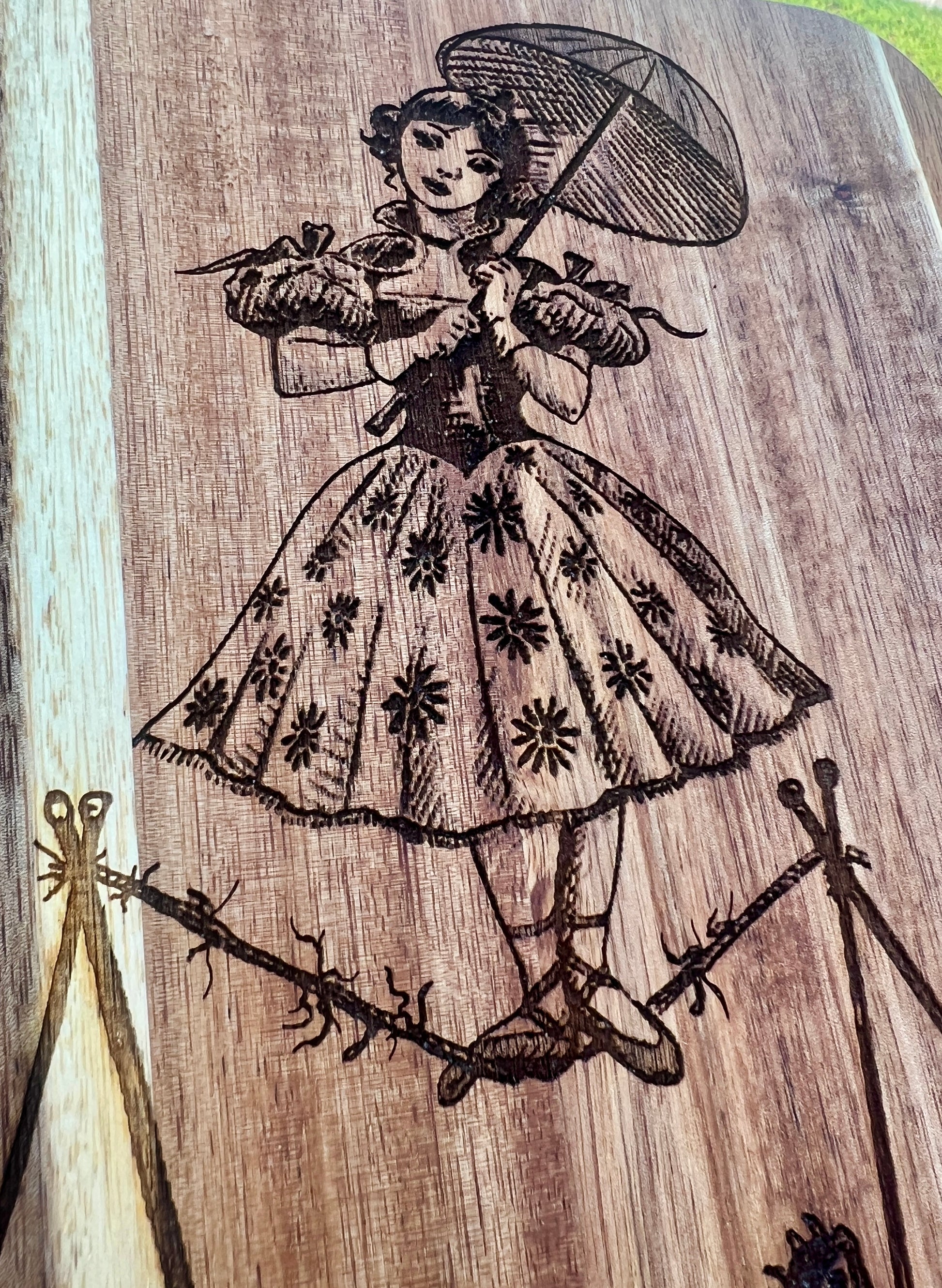 Charcuterie & Cutting Board - The Doomed Tightrope Walker from the stretching room! Sally Slater 16” X 8” engraved on Acaci