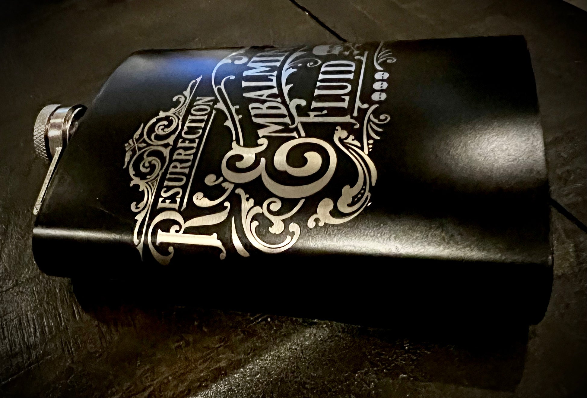Awesome stainless steel flask powder coated black with engraving of “Resurrection Embalming Fluid” design. Fun design. Includes funnel for easy filling