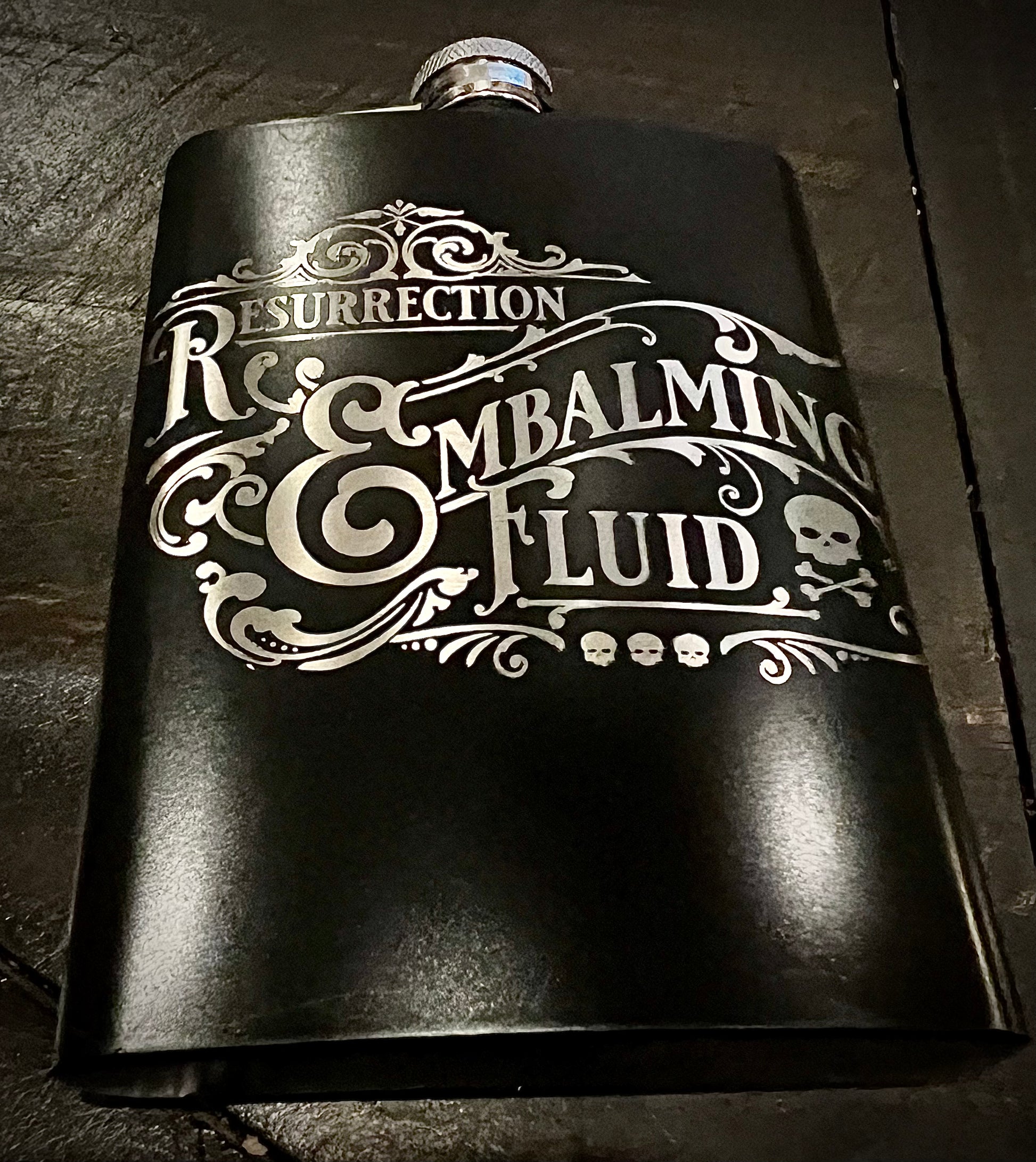Make sure you have enough of the good stuff to share with friends with the Resurrection Embalming Fluid 8oz flask! This cool, stainless steel accessory is professionally custom engraved with a spooky and fun design that's sure to turn heads. Put more "spirits" in your life!
