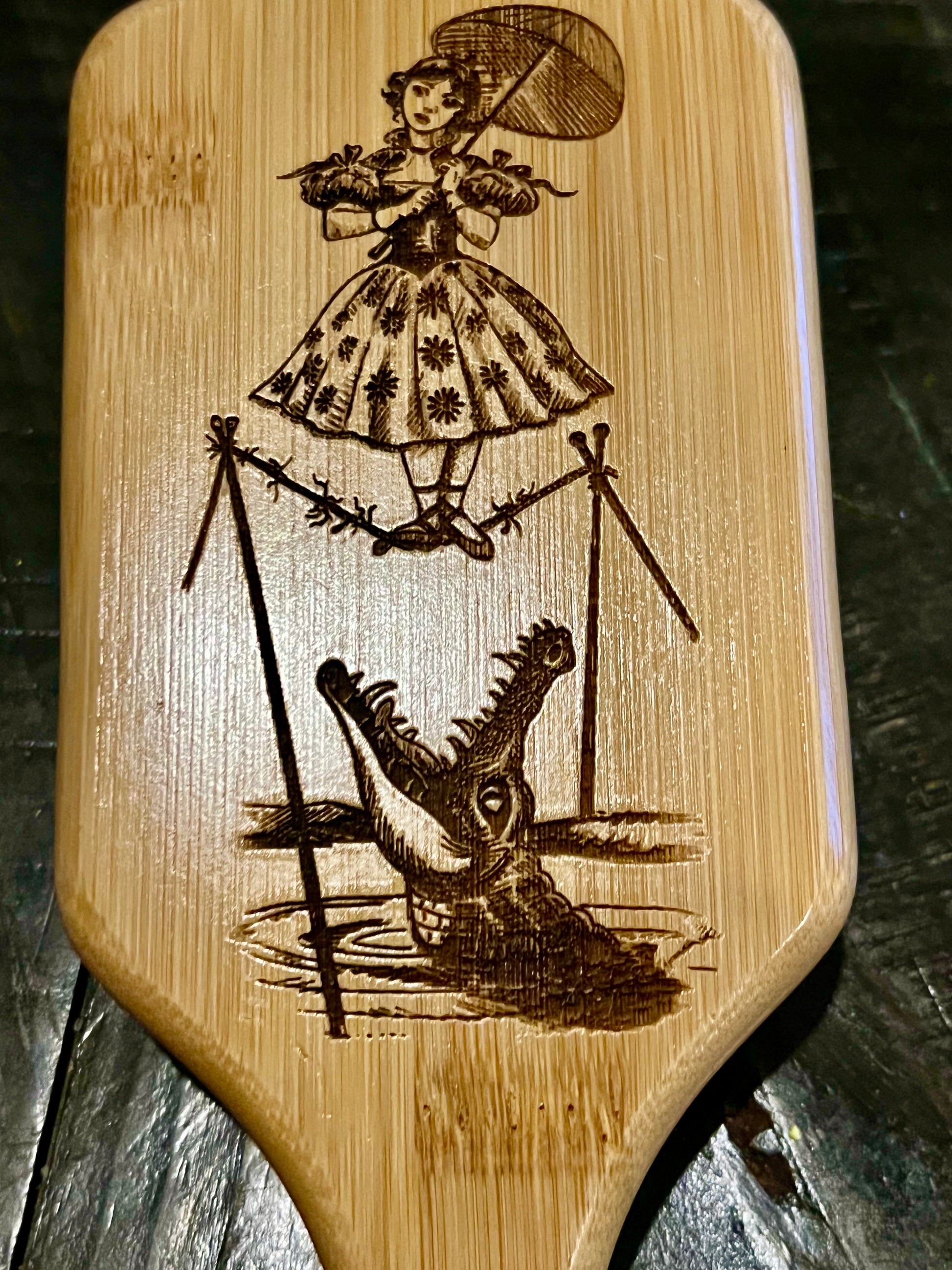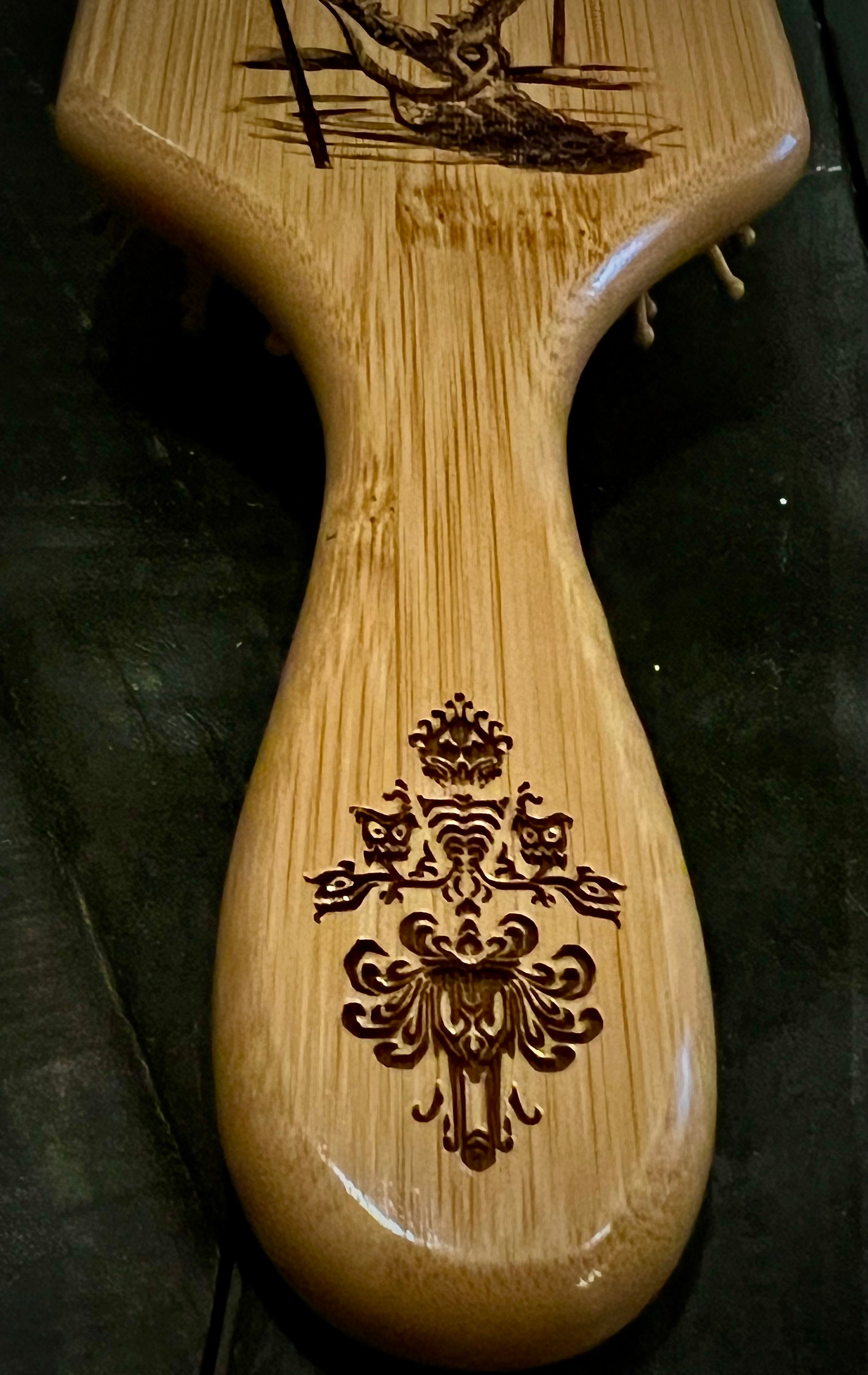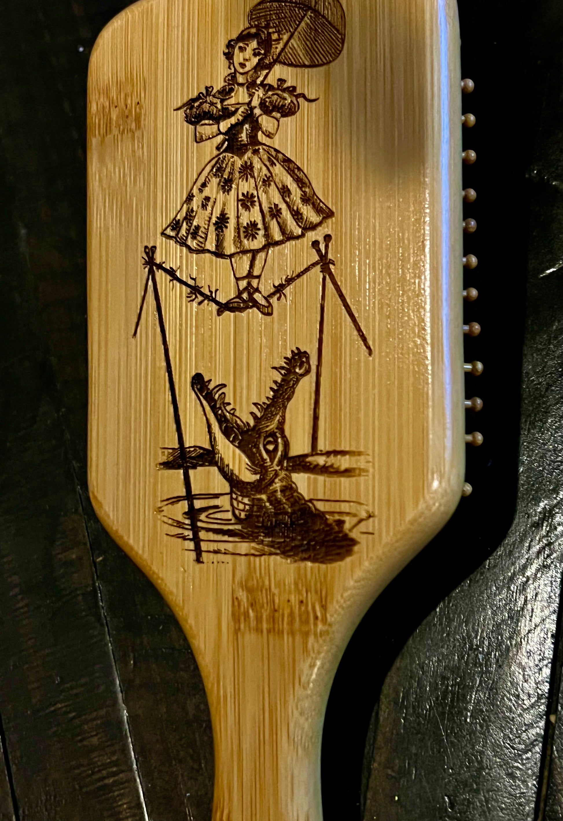 Foolish Mortals Beware the “Haunted Stretching Portrait Tightrope Walker Sally Slater” engraved hairbrush! Made of extra-large 9.5” eco-friendly bamboo. These frightfully soft bristles are sure to make you feel like you died and went to Heaven!