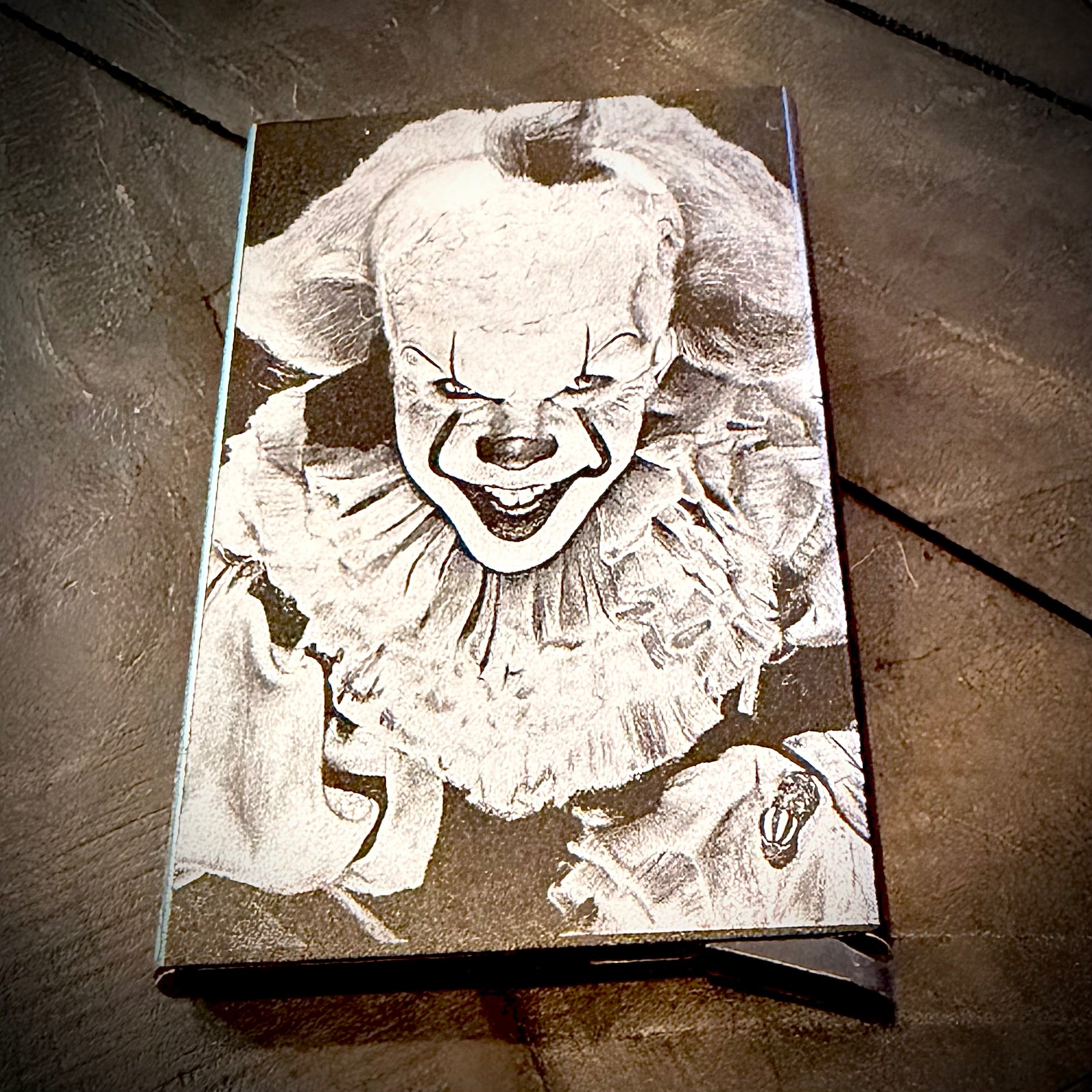 Introducing the frighteningly sleek Pennywise wallet. Made of metal and engraved with images of the infamous clown, this card wallet fits up to six cards comfortably. With a pop-up mechanism, it's perfect for hiding your money away in the most terrifying way possible.